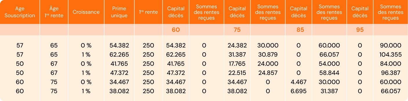 - En cas de décès à 75 ans, un montant total de 30 000 euros de rente aura été versé. Le ou les bénéficiaires désignés recevront 24 382 euros, soit le montant de la prime unique diminuée des rentes déjà perçues.